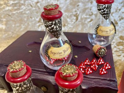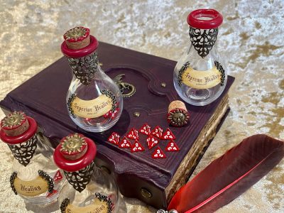 Potion of Healing (2 x D4 Dice), Potion of Greater Healing (4 x D4 Dice), Potion of Superior Healing (8 x D4 Dice), Potion of Supreme Healing (10 x D4 Dice) in a beautiful potion shaped glass bottle with teeny D4 Dice.
